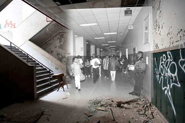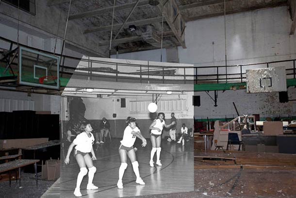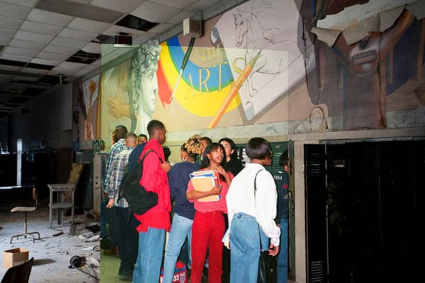 Une série de photos prises dans une école abandonnée de Détroit avec d’anciennes photos superposées.